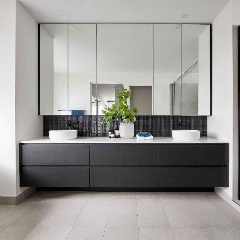 - Built-in storage to prevent countertop clutter (niche, recessed cabinet, linen solution)